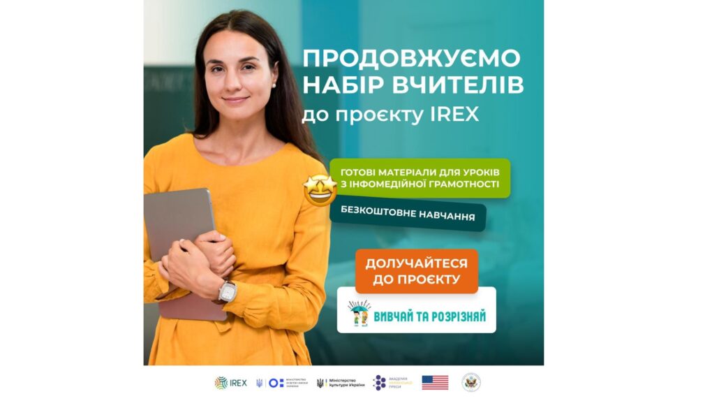 Проєкт «Вивчай та розрізняй: інфомедійна грамотність в освіті», що реалізується Радою міжнародних наукових обмінів та досліджень (IREX) за підтримки Посольства США в Україні, запрошує освітян стати частиною програми, що змінює підходи до освіти та сприяє розвитку медіаграмотності серед учнівства. Проєкт об’єднує освітян, які прагнуть інтегрувати навички інфомедійної грамотності та критичного мислення в освітній процес, допомагаючи учнівству безпечно орієнтуватися в сучасному інформаційному середовищі.